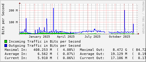 <h1>Traffic Analysis for Po26 -- e2-rt-1782a.ns.uwaterloo.ca</h1> <div id="sysdetails"> <table> <tr> <td>System:</td> <td>e2-rt-1782a.ns.uwaterloo.ca in E2 1782a</td> </tr> <tr> <td>Maintainer:</td> <td>noc@uwaterloo.ca </td> </tr> <tr> <td>Description:</td> <td>Port-channel26 po15-e2-sw-1717a-a </td> </tr> <tr> <td>ifType:</td> <td>propVirtual (53)</td> </tr> <tr> <td>ifName:</td> <td>Po26</td> </tr> <tr> <td>Max Speed:</td> <td>10.0 Gbits/s</td> </tr> <tr> <td>Ip:</td> <td>No Ip (No DNS name)</td> </tr> </table> </div>